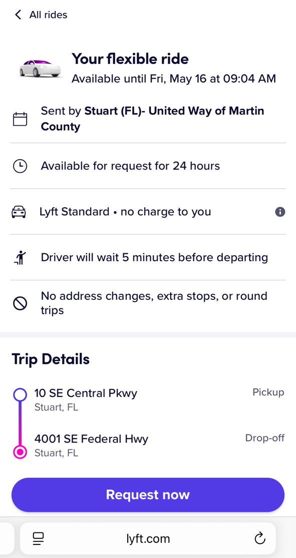 Ride United offers temporary, pre-scheduled LYFT rides to connect Martin County residents to education, employment, health care and other critical services. Those in need of transportation assistance should reach out to a participating agency to determine eligibility or schedule a ride.