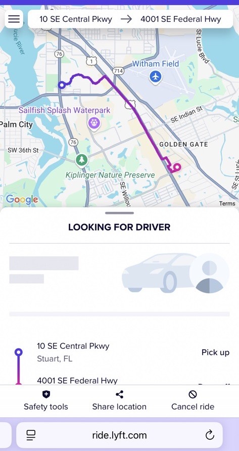 Once you request the ride, you’ll see a screen indicating that Lyft is searching for a nearby driver.