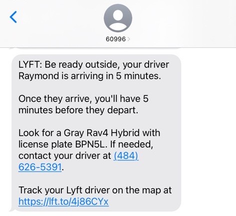 Once your ride is scheduled, you’ll receive a text message from Lyft at 60996.